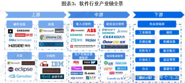 软件行业上游相关企业主要有硬件设备、系统、开发、中间件供应商,参与企业主要有三星、联想、神舟、微软、金蝶天燕等;中游相关企业主要有安全软件、财务管理软件、办公软件、其他软件供应商,代表企业有启明星辰、三六零、绿盟科技、宝信软件、用友、华胜天成等。下游涉及各种应用场景,如工业制造、交通运输、机械设备、航空航天等。