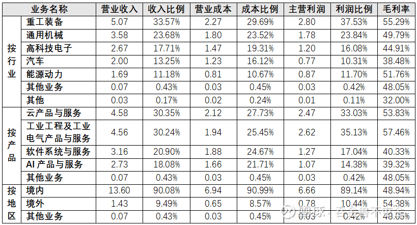 主营业务为 AI 产品与服务、云产品与服务、软件系统与服务、工业工程和工业电气产品与服务。