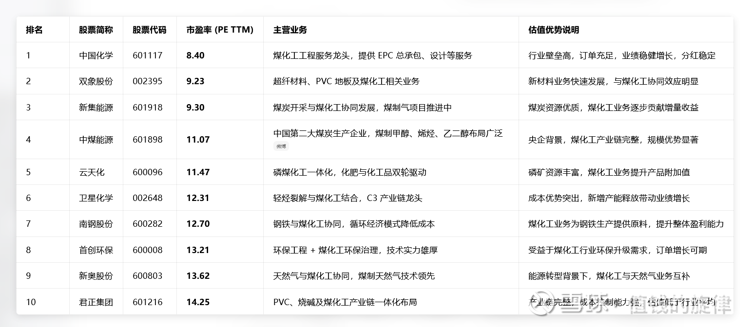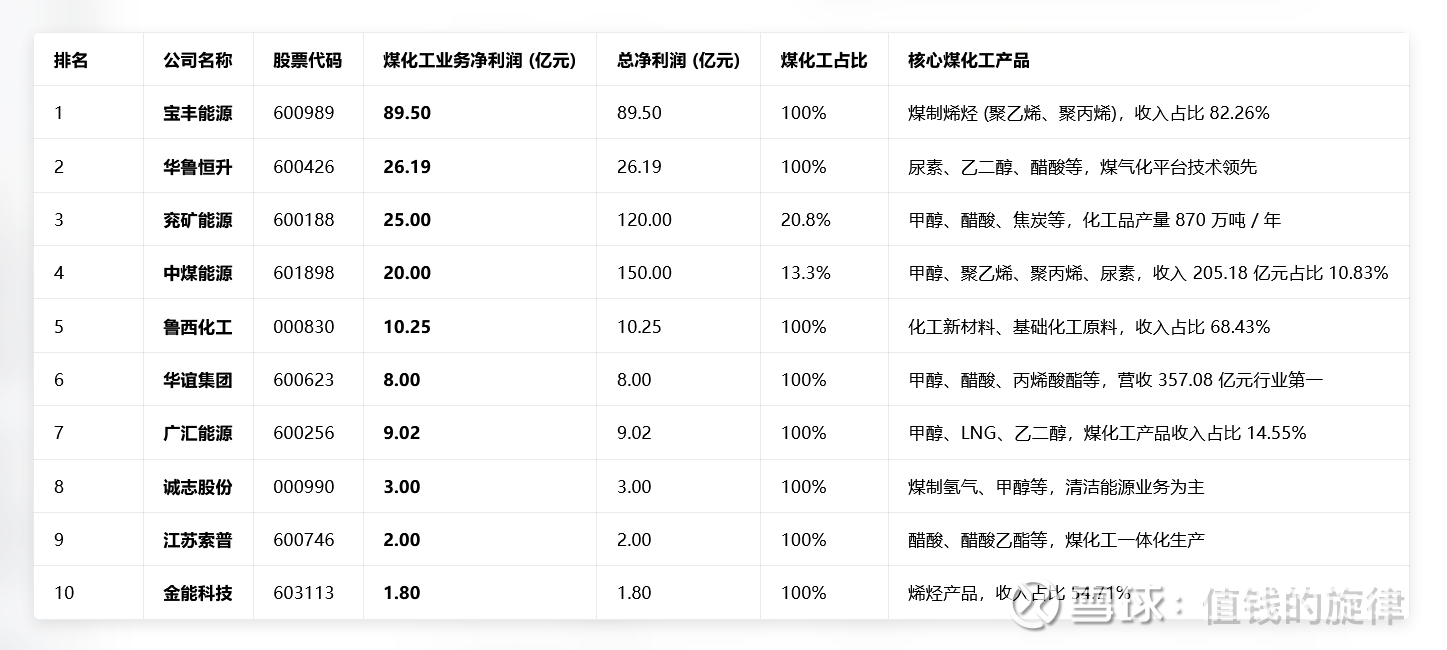 $兖矿能源(SH600188)$ 与中煤能源:煤炭与煤化工双轮驱动,煤化工业务虽收入占比不高(约10%),但盈利规模仍位居行业前列,主要受益于自产煤的成本优势。