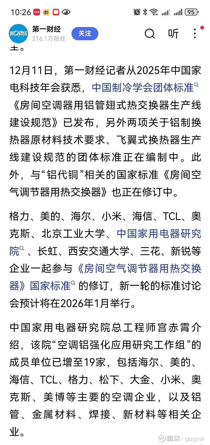 格力、美的、海尔、小米、海信、TCL、奥克斯、北京工业大学、中国家用电器研究院、长虹、西安交通大学、三花、新锐等企业一起参与《房间空气调节器用热交换器》国家标准的修订,新一轮的标准讨论会预计将在2026年1月举行。