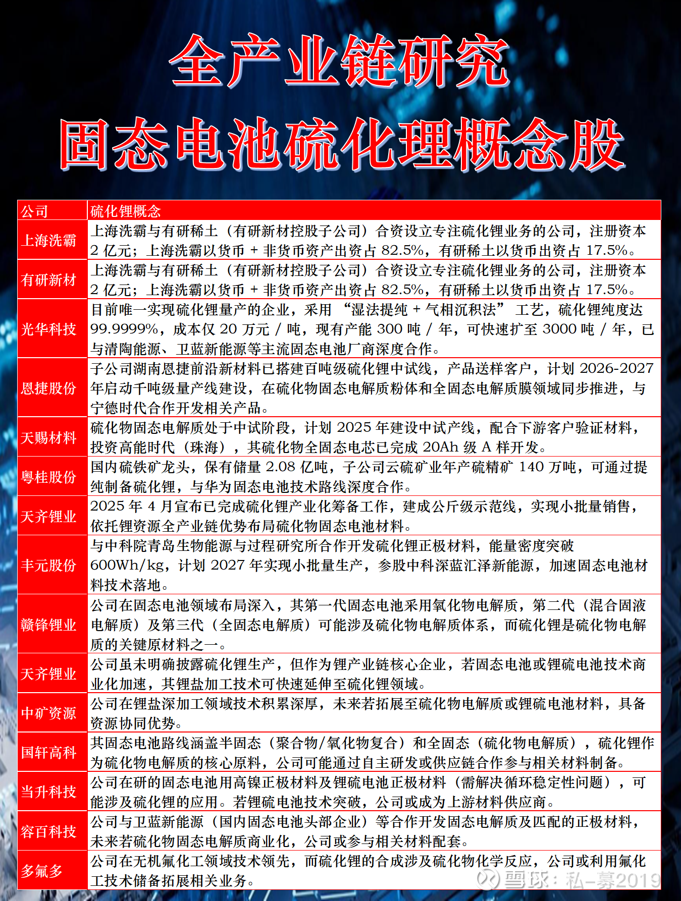 上海洗霸(603200.SH):竞得有研稀土硫化锂资产,合资公司持股 82.5%,计划 2026 年建成千吨级产线,主打 "低成本 + 高纯度" 路线。
