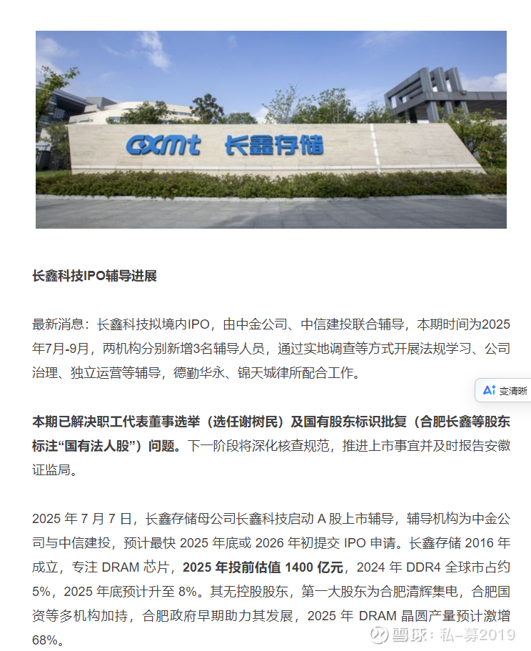 媒体曝长鑫IPO辅导进展 中金、中信建投联合辅导 预计最快 2025 年底或 2026 年初提交 IPO 申请
