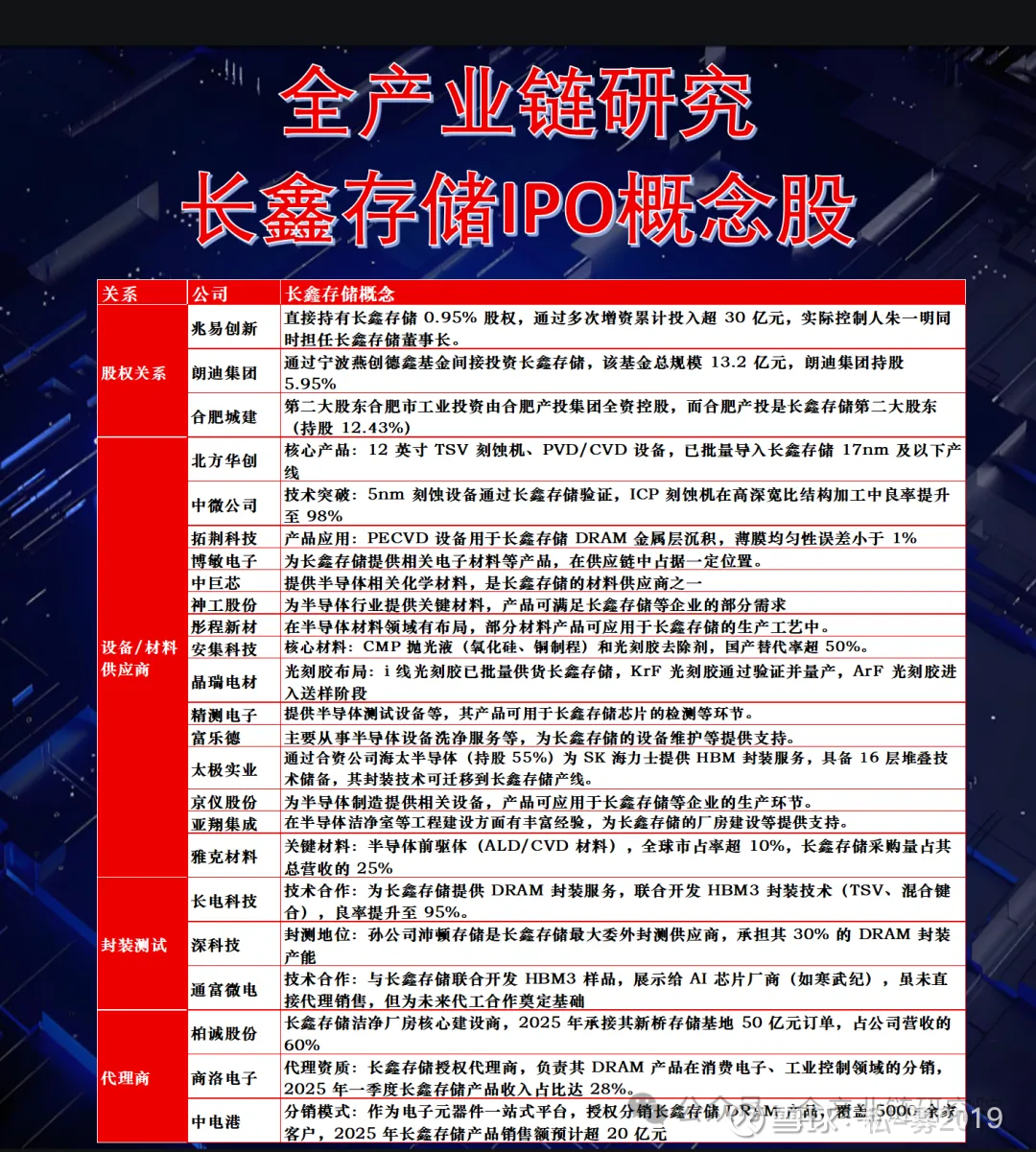 1、长鑫存储产业链分析DRAM行业现状与市场空间: DRAM行业当前处于需求上行周期,需求侧由传统需求复苏及人工智能、辅助驾驶、机器人等新兴应用长期支撑。全球DRAM未来年复合增速接近5%;中国DRAM市场占全球30%以上,主要依赖消费电子、汽车等终端产业,未来需求确定性高于行业整体,复合增速接近8%。全球DRAM市场以海外龙头为主,三星、海力士、美光三家厂商收入份额合计超90%;长鑫作为国内DRAM龙头,当前收入规模不足全球份额10%,服务国内或参与全球竞争均有较大成长空间。全球及长鑫产能进展: 全球DRAM产能方面,截至2024年底约为180万片/月,预计2025年底在部分新增产能推动下,将达190 - 200万片/月。其中,三星产能约65 - 66万片/月,海力士约50万片/月,美光约33万片/月,海外厂商扩产主要聚焦HBM等高端DRAM产能。国内长鑫存储截至2024年底产能约20万片/月,预计2025年底将增至30万片/月,同比增速近50%。届时,长鑫产能占全球比例约15.6%,超10%。产品结构升级与技术迭代: 长鑫存储正加速产品结构升级,从DDR4、LPDDR4向DDR5、LPDDR5过渡。2025年一季度DDR5全球份额约1%,预计四季度将提至7%;LPDDR5同期从0.5%提至9%。技术上,长鑫于2024年推出新一代16GB DDR5产品,采用16纳米工艺(跳过17纳米节点)。出货市占率预计2025年初为6%,年底提至8%。虽当前市场份额和产能规模小,但产品迭代和产能扩张将带来增长动力。2、晶合集成新投资机会3D DRAM技术背景与需求: 随着DRAM技术发展,其电容物理特性使制程微缩难度加大,传统光刻和刻蚀工艺难再缩小制程,产业界用HBM技术应对AI带来的GPU发展需求。HBM成本是DDR5的3倍以上,在Blackwell架构中占比达60%。为解决HBM成本问题并发展下一代存储芯片,产业界提出CBA架构,通过分离式制造和混合键合工艺集成,释放存储阵列平面空间资源,为提升存储密度提供新路径。国外凯霞、国内长存已用相关技术开发3D NAND,长存的芯片面积减少20%-30%,生产流程减少20%。未来DRAM或借鉴相关技术,晶合集成有望借CBA架构带来的逻辑芯片代工需求获得新发展空间。晶合产能与未来规划: 晶合集成当前产能约14万片/月,老厂11万片/月,工艺为150-90纳米,产品为pimic、ddic和ciss;新厂三期3万片/月,工艺55纳米,产品为C4。2025年下半年计划扩产2万片/月,年底总产能达16-17万片/月。2026年继续扩展3万片/月,工艺涉及28纳米和40纳米。28纳米高压产品2025年底小批量上市,2026年持续放量;逻辑芯片已持续流片,预计2026年上半年量产。合作潜力与估值优势: 合肥本土半导体产业链完善,涵盖存储芯片、封测、面板等。以长鑫为核心的DRAM产能未来将持续释放,有望与晶合集成形成新合作机会。随着公司28纳米产线扩张及新产品放量,当前估值具性价比。