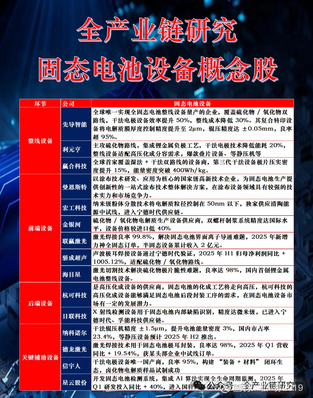 辊压成膜环节企业: 辊压成膜环节主要关注纳克诺尔。该公司持续提升产品性能,其22滚新品有两方面技术变化:一是通过黏结剂改性实现更好的鲜化能力,解决固固材料接触结合力不足的痛点;二是对活性材料及导电性进行处理,提高干法环节的稳定性和流动性,进一步提升压实密度及循环寿命。目前该产品在国内进展领先,除已深度合作的几家头部大厂外,近期正逐渐参与2025年下半年的招标,且公司技术正在为未来瓦时量产线进行整体研制。
