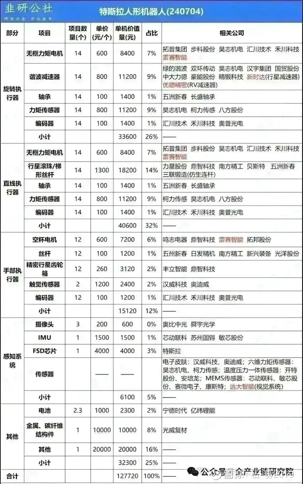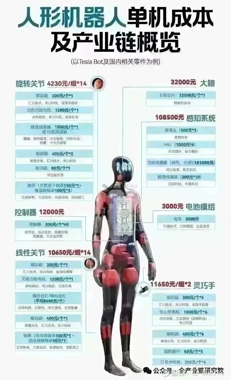当前成本与目标: 当前人形机器人整机成本约30万至50万(接近50万)。成本结构中,传感器系统(如六维力传感器、720度视觉系统)占比最高;关节驱动模块次之,包含62个自由度的各类电机,其中行星滚柱丝杠单机用量20套(试做价2500元/套,量产价可降至900元/套)、谐波减速器单机用量30套(市作价1200元/套);此外,AI芯片(单机3个独立芯片)、8小时续航电池、镁铝合金骨架及VLA大模型训练费用等也构成主要成本。未来规模化量产目标成本需控制在20万至30万,低于特斯拉目标售价(约30万)。