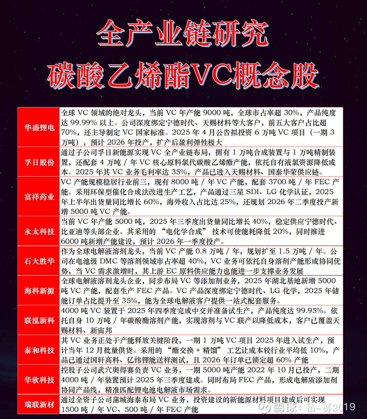 VC 碳酸亚乙烯酯,是锂电池电解液的核心添加剂,碳酸乙烯酯 EC,常作为 VC 生产的核心原料。
