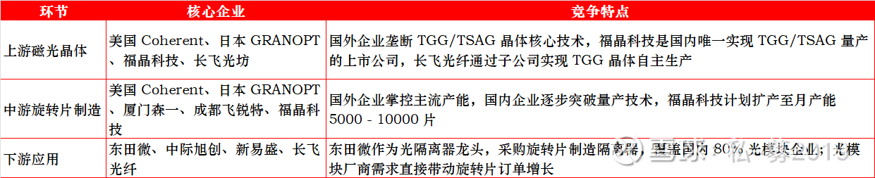 法拉第旋转片作为光通信领域 “卡脖子” 环节,国内政策层面鼓励核心材料国产化。同时,国外企业垄断供应且限制出货,倒逼国内光模块及器件厂商优先采购国产产品,为福晶科技、东田微等企业提供了市场机会。