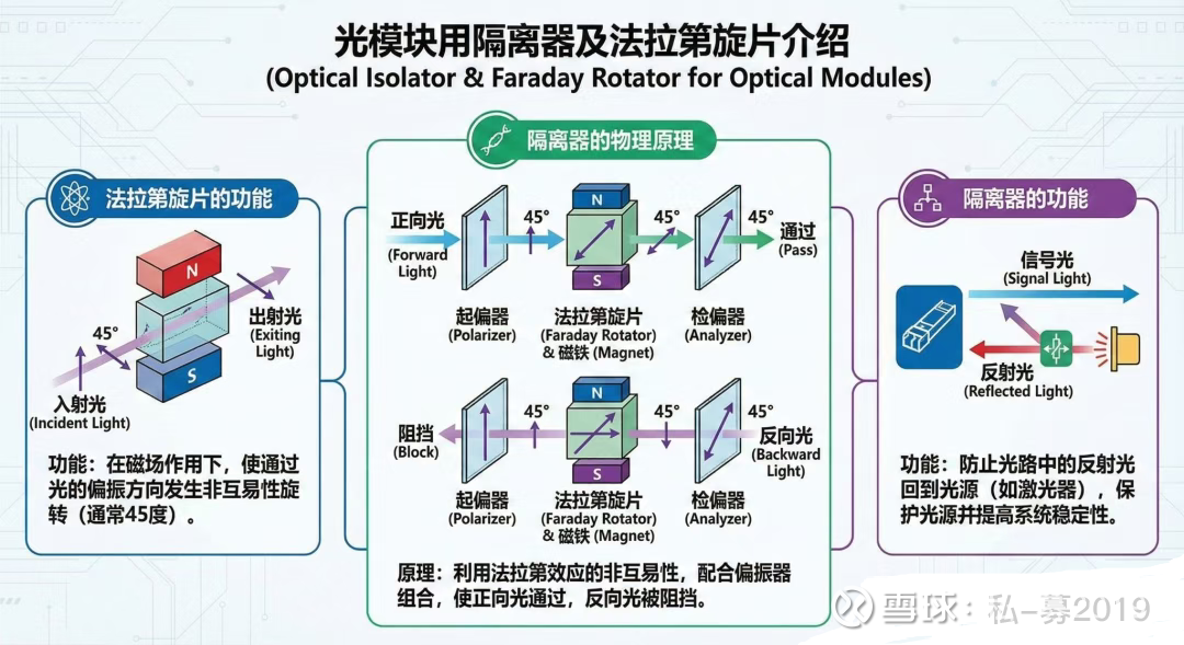 隔离器功能与原理: 隔离器核心功能为隔离反射光,避免其干扰光源系统(特别是激光器)性能,保护光源并提高系统稳定性。其工作依赖上游核心部件法拉第旋片,该旋片在磁场作用下,使光偏振方向发生非互易性旋转(通常45度)。具体为:入射光通过时偏振方向顺时针偏移45度后通过,反射光反向入射时,因非互易性继续顺时针偏移45度,无法通过。可见,法拉第旋片是实现非互易性旋转的核心部件。