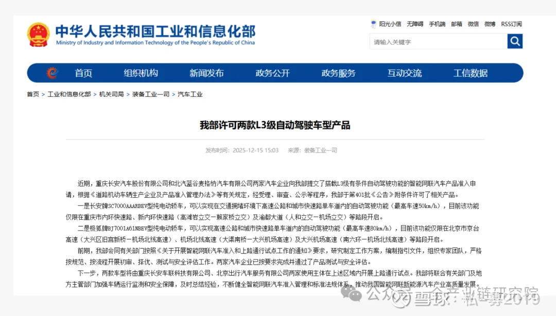 1、近期,重庆长安汽车股份有限公司和北汽蓝谷麦格纳汽车有限公司两家汽车企业向工信部提交了搭载L3级有条件自动驾驶功能的智能网联汽车产品准入申请,根据《道路机动车辆生产企业及产品准入管理办法》等有关规定,经受理、审查、公示等程序,我部于第401批《公告》附条件许可了相关产品。
