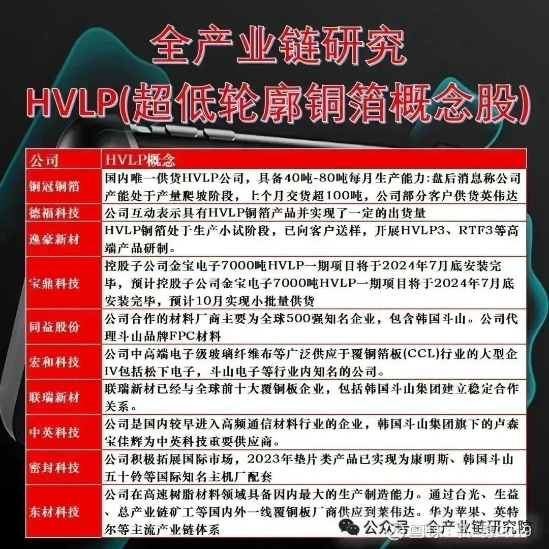 HVLP4标的推荐逻辑:铜箔厂商排序以铜冠为主,其核心优势在于大客户为台资大客户,在科部份额锁定多,新板子(MID plane CB叉、中腰背板)拿大头预期浓,且搭配板子大概率上4。进度方面,铜冠2025年9月过大客户验证,10-11月逐步起量,2026年一季度量级较2025年四季度明显提升,跟着大客户拿新板子放量逻辑通顺,是HOP4环节首推标的。