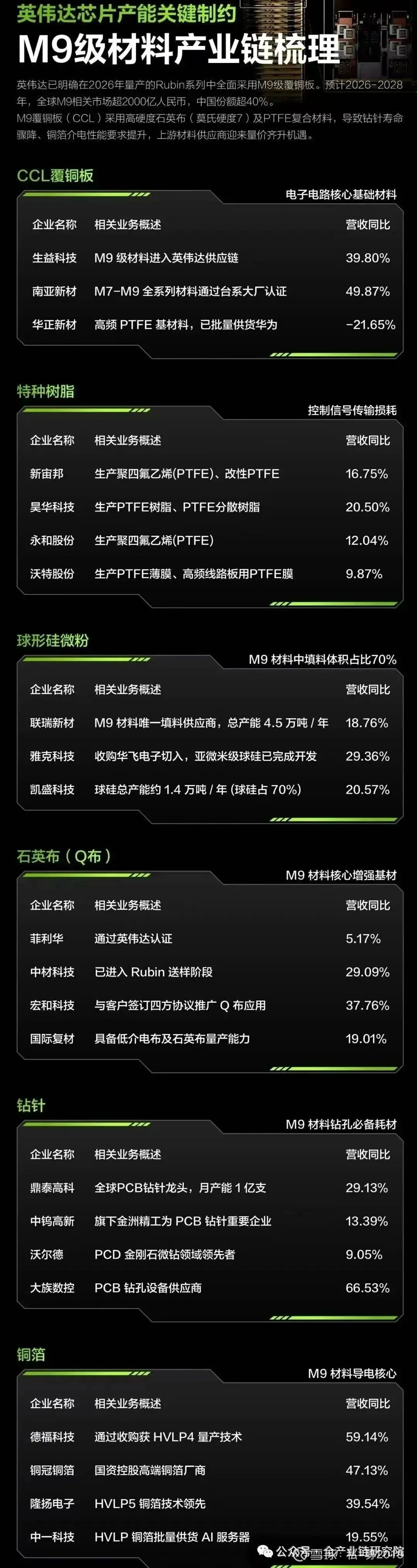 ·核心逻辑与标的总结:认为北美算力板块存在贝塔向上预期,投资者关注是否可能从26年估值向27年切换;指出26年往27年估值切换的最大变量是正胶背板,最大增量在Q布及HVLP4;标的层面,Q布供应链供应格局良好,主流板厂中供应商集中,排序为科利华、中材,HVLP4标的为铜冠。