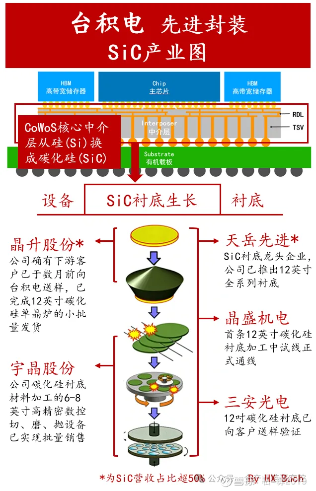 碳化硅中介层优劣势与挑战:认可碳化硅替代硅中介层的整体逻辑,但从技术与供应链层面来看,其大规模应用仍存在诸多挑战。技术加工层面,TSV加工涉及的研磨、CMP等工序较为复杂,对设备及对应加工工艺要求极高,目前较难实现与硅材料相当的平整度、垂直度,需依赖更先进的设备推进。供应链层面,碳化硅晶圆制备存在尺寸适配难题,当前量产设备多为12寸规格,若大规模应用于封装环节,12寸碳化硅晶圆更能实现有效衔接,但目前12寸碳化硅制备难度大,若仅能供应8寸或4倍8寸规格产品,将难以匹配现有设备需求,存在供应端挑战。不过碳化硅材料具备散热、绝缘性能更优的核心优势,只是其功耗表现目前暂不明确。整体而言,碳化硅中介层的技术逻辑具备合理性,但技术加工复杂度高、大尺寸晶圆供应不足等问题,成为其大规模量产应用的主要障碍。