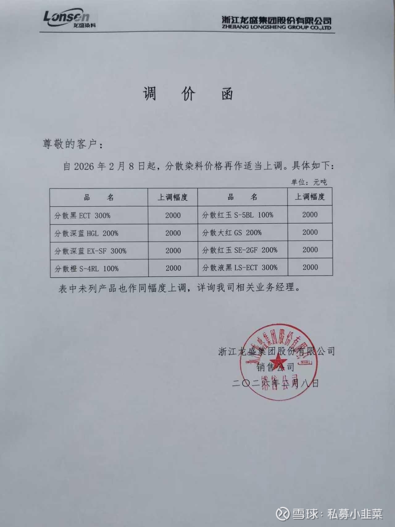 浙江龙盛分散染料涨价函