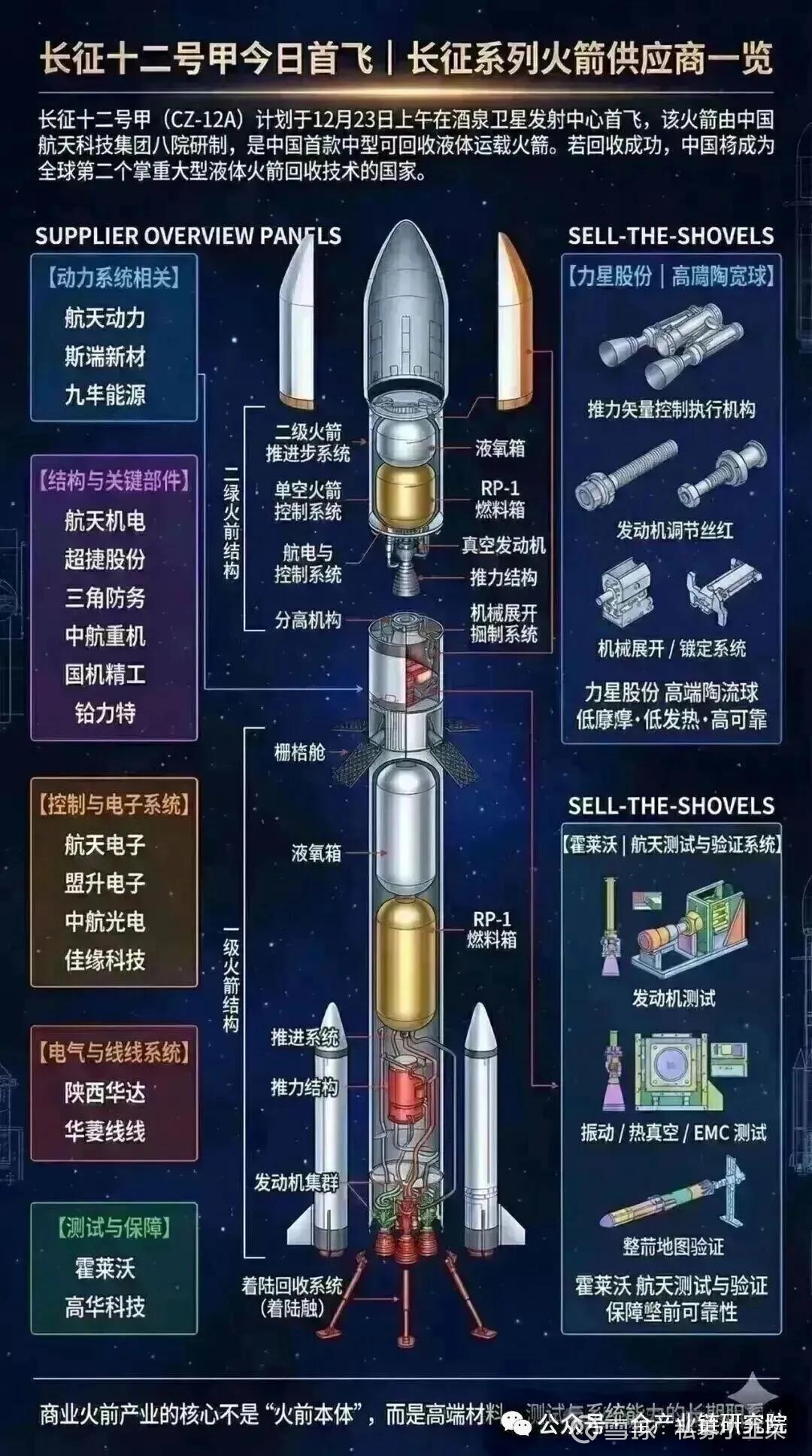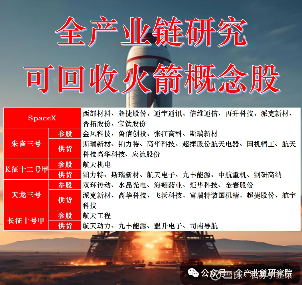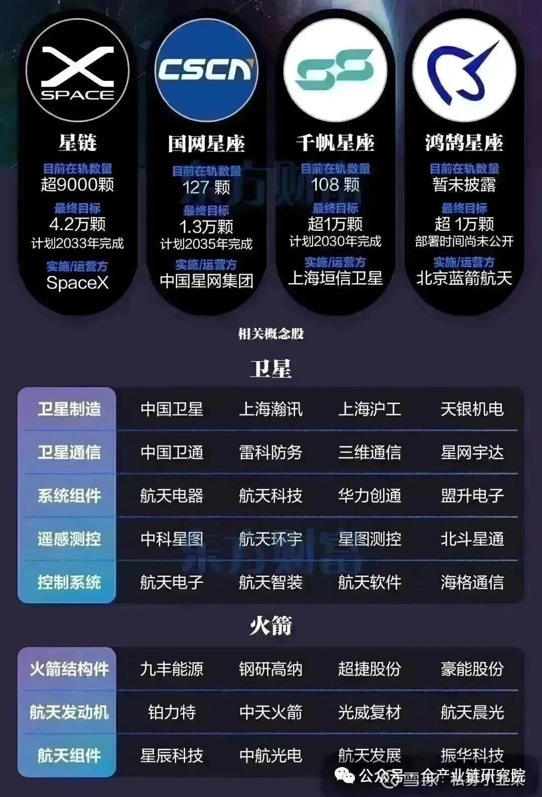 a.上游:运载火箭核心部件相关标的包括振华风光和航天发展,航天发展主打航天防务、信息技术和装备制造业务,拥有防空导弹系统、飞航导弹系统、固定火箭以及空间技术等产品;低轨通信卫星载荷相关标的有航天环宇、雷电微力、国博电子、铖昌科技,聚焦天线单元领域。