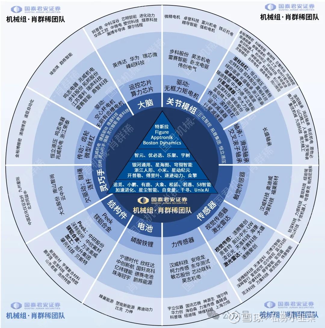 ·行业竞争格局分析:当前机器人行业整体处于商业化落地前夜,尚未有企业实现大规模盈利,各市场参与方仍处于市场化赛跑阶段,尚未跑通成熟的商业化盈利模式。国内核心竞争企业各有差异化优势:a. 宇树运控能力突出,其春晚展示的产品运控表现获得行业高度认可,同时成本控制能力优异,产品定价较低,小场景下的运动平衡性与控制能力处于行业领先地位,此外已布局危险场景(如火场救援)专用机器人,开辟差异化细分赛道;b. 优必选行业布局较早,已在多个场景完成机器人落地部署,算力层面储备了充足的相关数据,技术积淀深厚;c. 位于上海的智元高度认可数据的核心价值,已布局素材工厂,正在推进相关数据积累工作。海外龙头特斯拉领先优势明显,凭借自有汽车厂作为天然的产品训练场景,无需对接外部工厂获取训练数据,同时自有人工智能团队可自主研发相关模型,无需依赖外部技术支持,目前在行业赛跑中领先其他企业半个到一个身位。未来行业格局将向手机行业靠拢,预计形成分层竞争态势:2-3家头部厂商将推出通用型产品,类似手机行业的安卓、苹果阵营,占据主要市场份额;其余厂商将聚焦各类细分场景,打造专用型产品(如特殊工作场景、危险救援场景专用机器人等),找到自身生存空间,最终实现全行业的商业化落地。