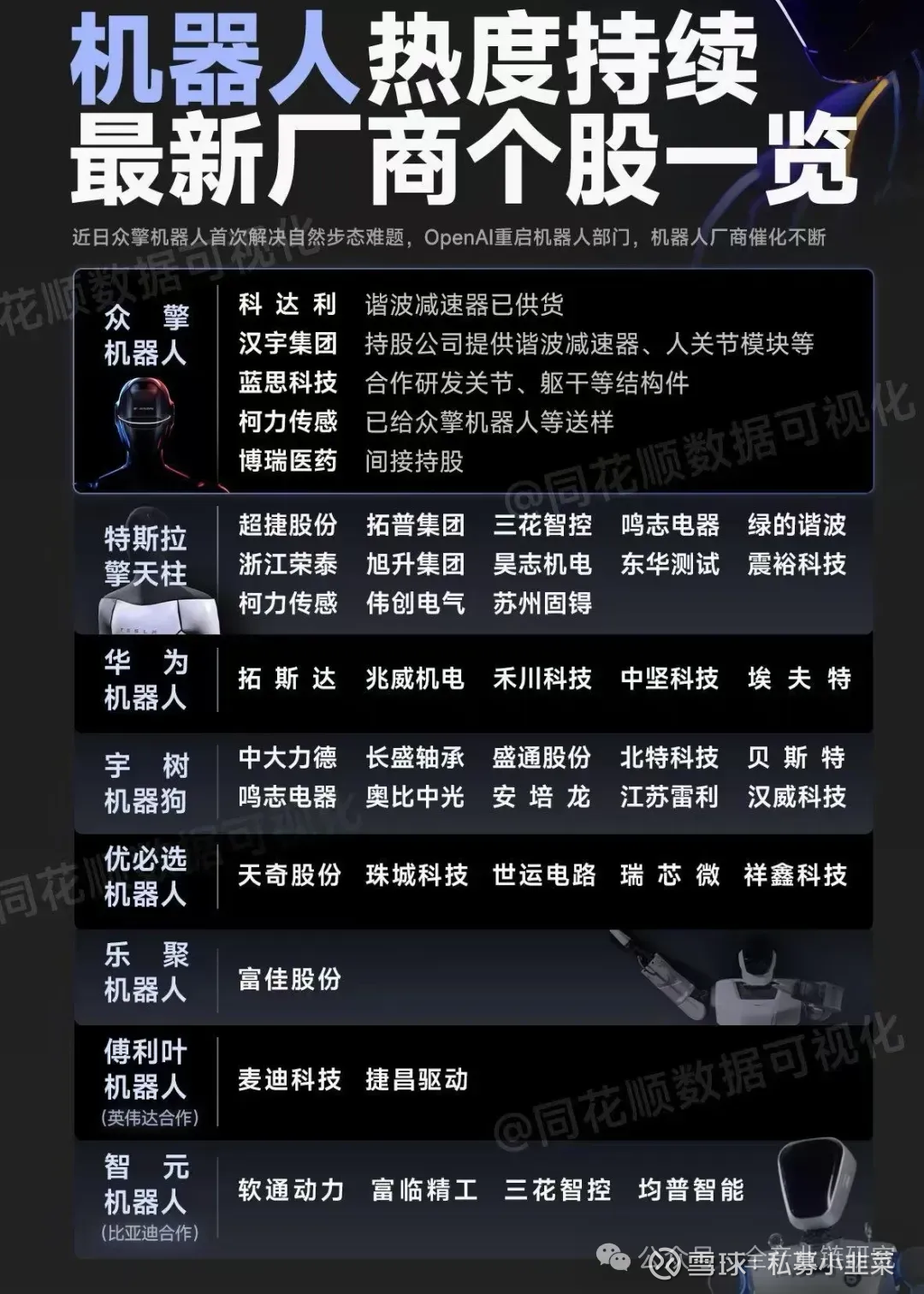 A: 所提到的核心公司及情况如下:拓普集团、三花智控、绿德谐波、明志电器、赵微机电、五洲新春、星舰传动、福莱新材、克力传感/汉威科技、奥比中光、蒙利和蒙英科技、鼎智科技;此外双环传动主营精密齿轮,可能通过拓普供货;浙江荣泰主营云母材料和齿轮,处于认证推进中。