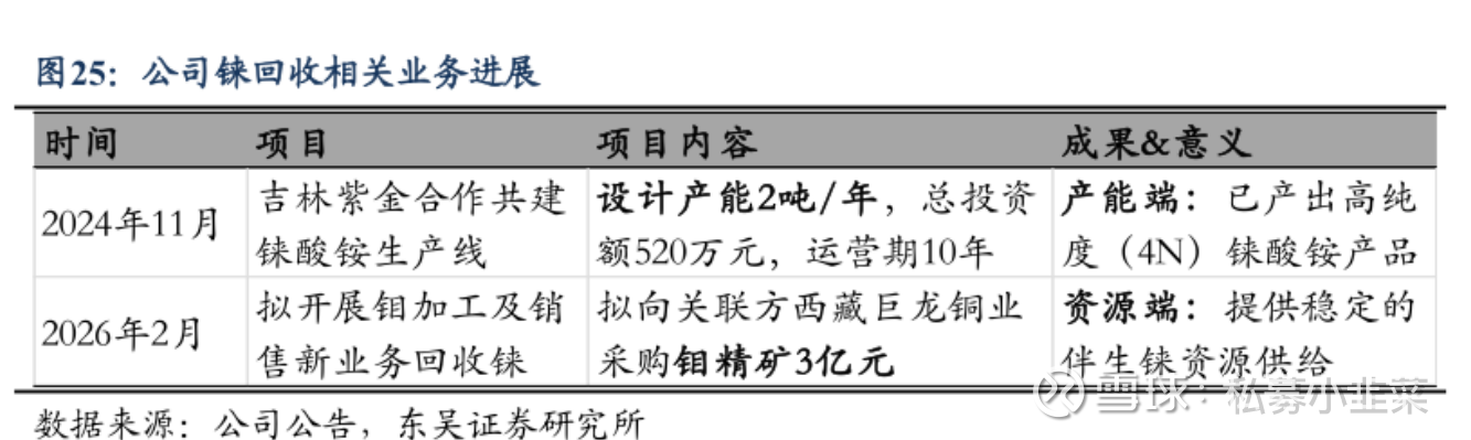 国内布局铼生产相关的企业,比如赛恩斯。赛恩斯深度绑定紫金矿业,紫金矿业持股赛恩斯21%,2024年11月与吉林紫金共建2吨/年铼酸铵生产线,目前已产出高纯度(4N)铼酸铵产品,26年开展钼回收业务,预计26年采购西藏巨龙3亿元钼精矿以保障原材料供应。