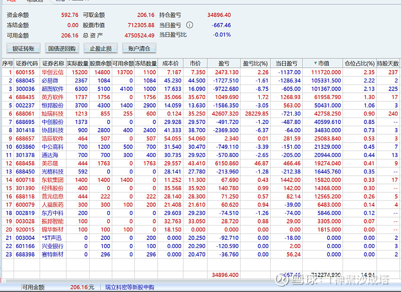 从我的视角看,借着昨晚纳指大涨,和诸多科技新闻,开盘芯片股有一波冲高,不过是诱多,被压了下来,很快就陷入调整,盘中有过几次抵抗,跟着全是跳水,又有绞肉馅的感觉,尾盘万科异动涨了3%,可能有资金,在赌我们周末降息,但大家都被套在大科技线上,情绪明显不佳,收盘3404家下跌,大幅缩量8172亿,成交2.35万亿。。。操作,东软集团56亿订单一字涨停,可惜我昨天几乎卖光,其实我知道他汽车域控制器是热门,并且pb很低是低估的,盘口一直也有资金在反复吸纳,是个安全性和值搏率都很高的标的,可惜昨天大调整时,考虑账户整体风险,又充当血包给卖掉了,这就是命啊,其实经常会这样,在你多考虑风险时,就会丧失很多机会,在你光考虑机会时,又会冒出重大风险,二者不可得兼;华创云信,破净券商整合太平洋,只能继续拿着;开盘去抄必易微,有点儿惨的,其实位置还是高,但他基本面确实在改善,关键是我之前赚过大钱,总是在盯着他,就很容易被诱进去;加仓了超图软件,盘口有大资金在码盘,不知道是诱多,还是提前演习;英方软件,做了个T,盘中发布鲲鹏备份一体机方案,异动涨了一下,位置并不高,没敢减仓当血包,怕成东软第二;恒邦黄金配置被套中,其它继续分散,各有千秋;今天微亏544元,今年赚36.5万元,持仓71万元,总仓位15%,借余钱做逆回购,等待打北交所新股REIT,下周一北交所新股奥美森申购,预计382万能中一手,392很稳,402万上帝视角,下午16点,默默合上笔记本。
