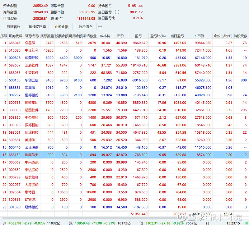 从我的视角看,保险券商银行有色砸盘,中信证券连续两天大跌,也没查到什么利空,可能是最近退市股赔付有点多,谁ipo承销多,谁就有风险,结果就是资金就继续干题材,军工、脑机、商业航天太猛了,盘中几次砸盘,都被狂热散户买起来,生猛搞出15连阳,收盘3731家上涨,1595涨下跌,缩量553亿,但依然是2.82万亿的高量能;。。。操作,做T必易微,正在崛起的小盘模拟芯片,股东询价转让减持影响不大,估计晚上就会有大宗回报;略减华创云信,券商不敢加,加了东莞控股,这么操作似不太对劲;减了浩辰软件,追了中望软件,两支CAD软件做动平衡,都受益AI+制造;东软集团,超图软件,上涨过程中边踢边减,快减没了,也不回头了;开仓帝奥微,因为位置看着低,恒邦股份黄金要配置的,其它继续分散,题材满天飞都在高位,我减了,就无处下嘴,今天真的不敢再追了,只能买了中证红利etf,填补部份缺口,美股期指是跌的,估计明天开盘有一跌,明天再找机会吧;今天赚8823元,今年赚3.5万,盈利创新高,仓位66万15%,余钱做逆回购,下午16点,默默合上笔记本。
