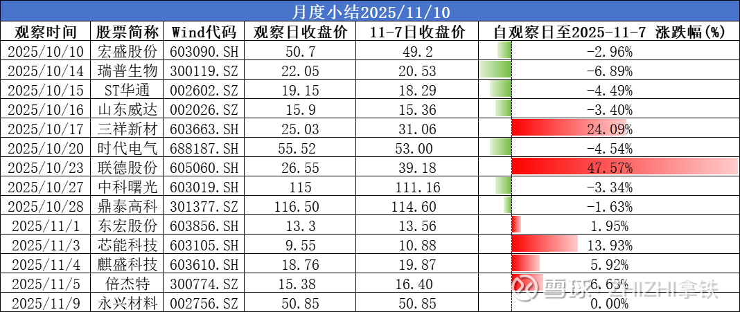 进入四季度,市场在震荡中寻找方向。在雪球写一个月文章了,我在10月至11月初陆续跟踪的这批股票,虽然多数标的随盘调整,但组合中跑出的两匹“黑马”,贡献了惊人的超额收益,让本月观察充满看点。