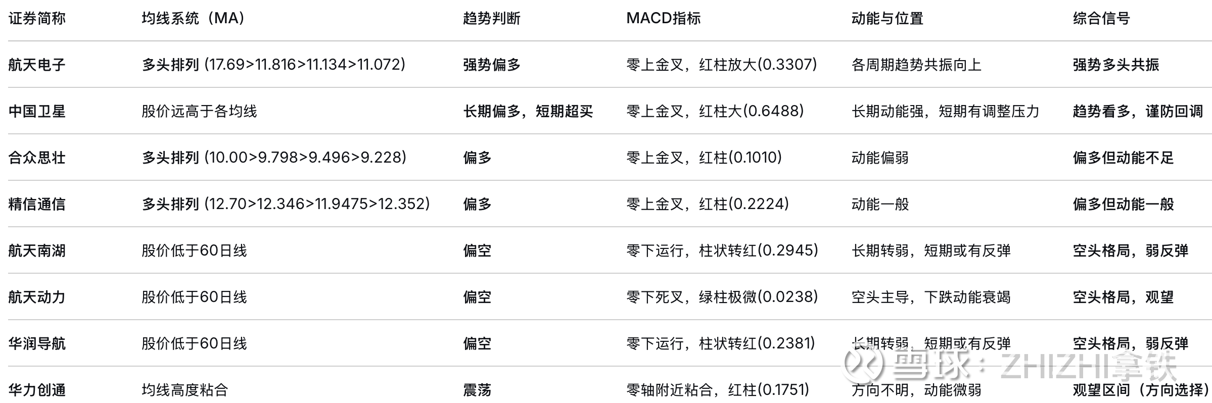航天电子 (000879.SH):是当前信号最强劲的个股。其均线呈标准的多头排列(5日>10日>20日>60日),且MACD在零轴上方形成金叉(DIFF>DEA),红柱持续放大(0.3307),显示从短、中、长期看,其上涨趋势均得到量价和动能的充分确认,属于典型的“多头共振”。