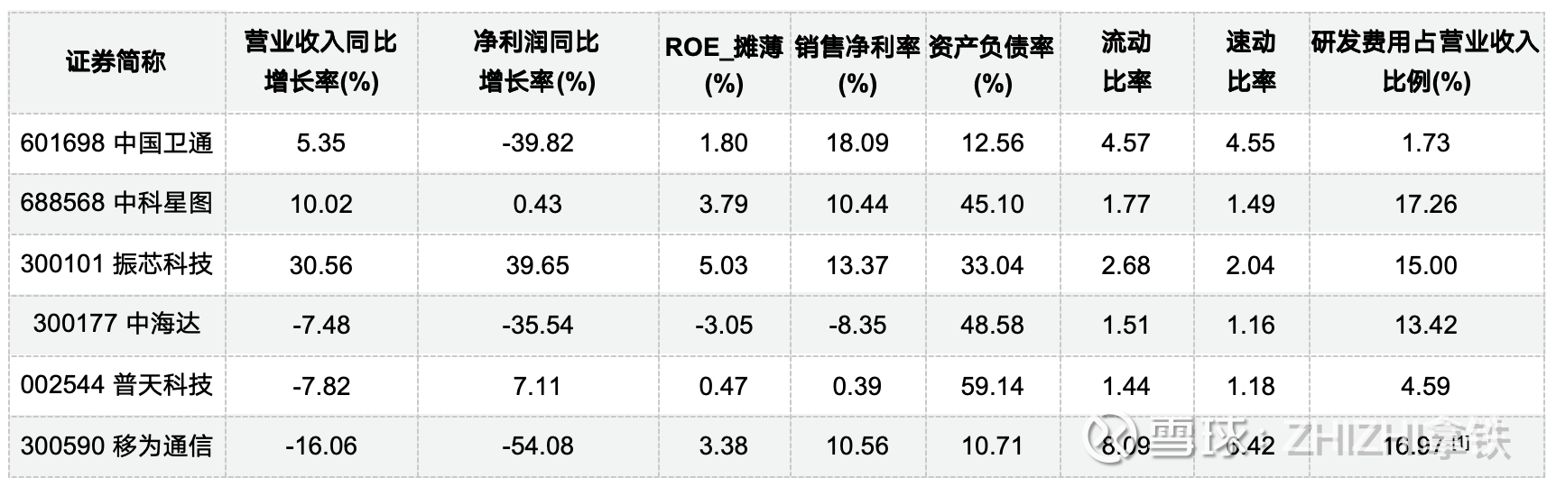 盈利质量分化明显:中国卫通销售净利率达18.09%,但净利润同比大幅下滑39.82%,显示盈利稳定性不足;振芯科技净利率13.37%,净利润增长39.65%,盈利质量较优;中海达销售净利率为-8.35%,处于亏损状态;普天科技净利率仅为0.39%,盈利微薄;移为通信净利率10.56%,但净利润同比下滑54.08%,盈利持续性值得关注。
