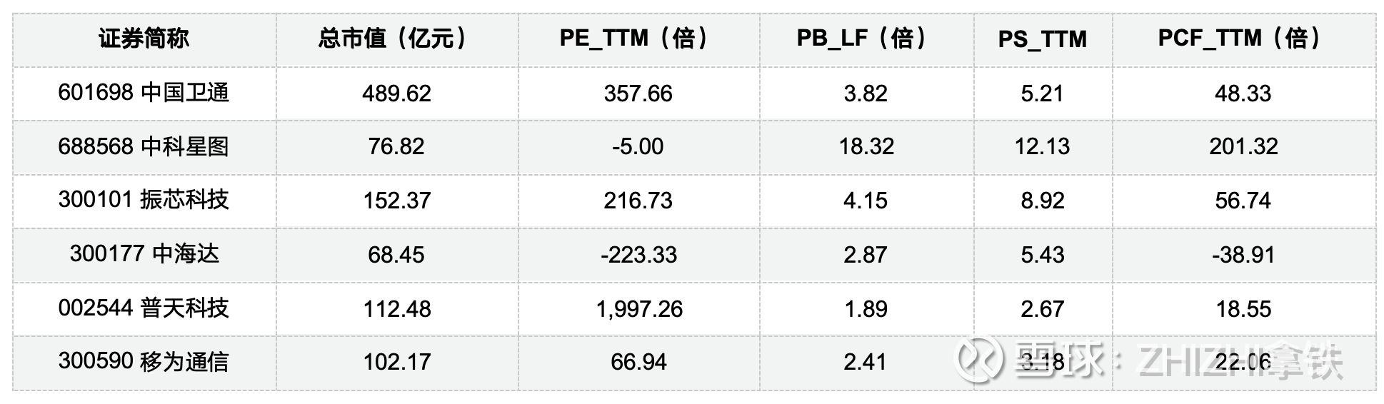 从市现率(PCF_TTM)来看:中科星图(201.32倍) 的PCF极高,说明其经营活动现金流相对微弱,估值更多依赖未来预期;振芯科技(56.74倍) 与 中国卫通(48.33倍) 也处于较高水平;移为通信(22.06倍) 与 普天科技(18.55倍) 相对较低,现金流状况相对稳健。