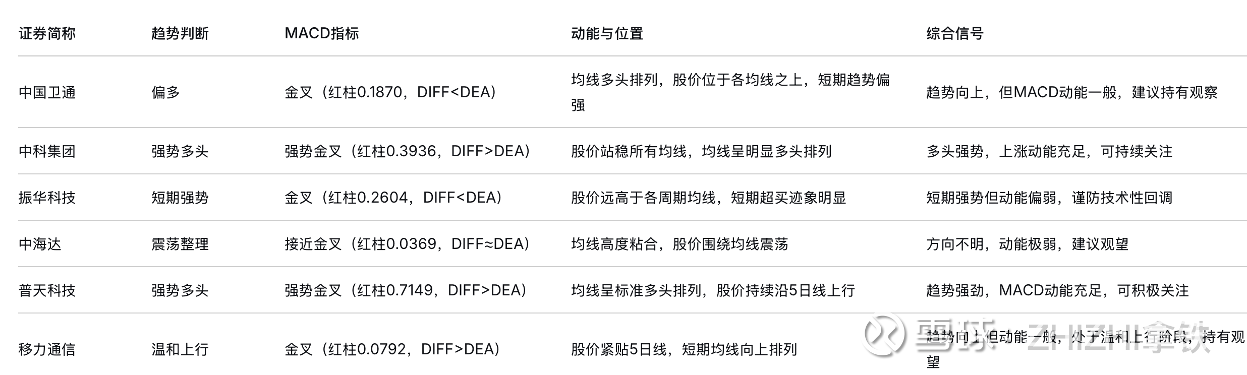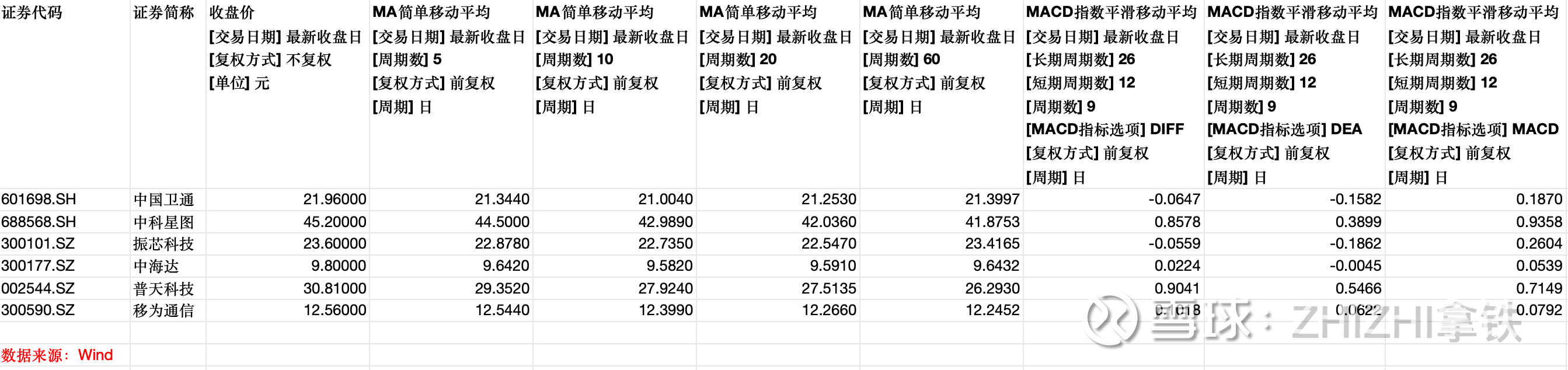 我们依旧根据MA+MACD技术指标综合分析,当前相关个股呈现明显分化格局。以普天科技和中科集团为代表的公司展现出“强势多头”特征,其均线系统呈标准多头排列,MACD形成强势金叉且红柱放大,上涨动能充足,技术形态最为健康。中国卫通和移力通信处于“趋势偏多”状态,均线系统支持上行,但MACD动能相对一般,上涨的持续性和力度有待观察。振华科技则呈现“短期强势与超买”并存的状态,股价大幅脱离均线系统,尽管MACD维持金叉,但动能已显疲弱,短期回调压力较大。中海达则陷入“震荡整理”格局,均线高度粘合,MACD接近零轴,多空力量暂时均衡,缺乏明确方向指引。总体而言,市场技术面呈现出“强趋势、弱动能、整理观望”并存的复杂结构。