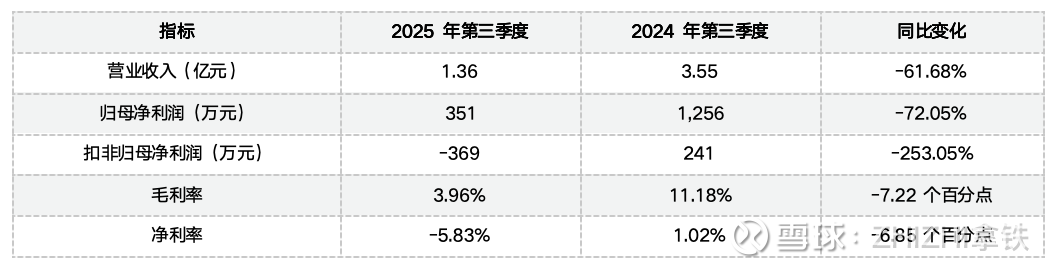 2025年第三季度,线上线下实现营业收入1.36亿元,同比下降61.68%;归属于上市公司股东的净利润为351万元(前三季度累计),同比下滑72.05%。值得注意的是,扣除非经常性损益后的净利润为-369万元,表明公司主营业务已陷入持续亏损状态。