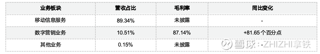 公司业务主要分为三大板块:移动信息服务、云通信服务和数字营销服务。2025年上半年数据显示,移动信息服务占比89.34%,数字营销业务占比10.51%,其他业务占比0.15%。