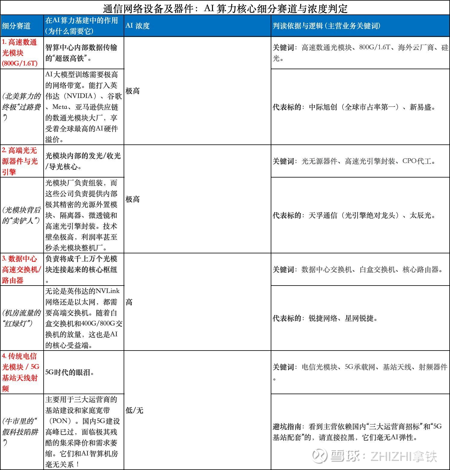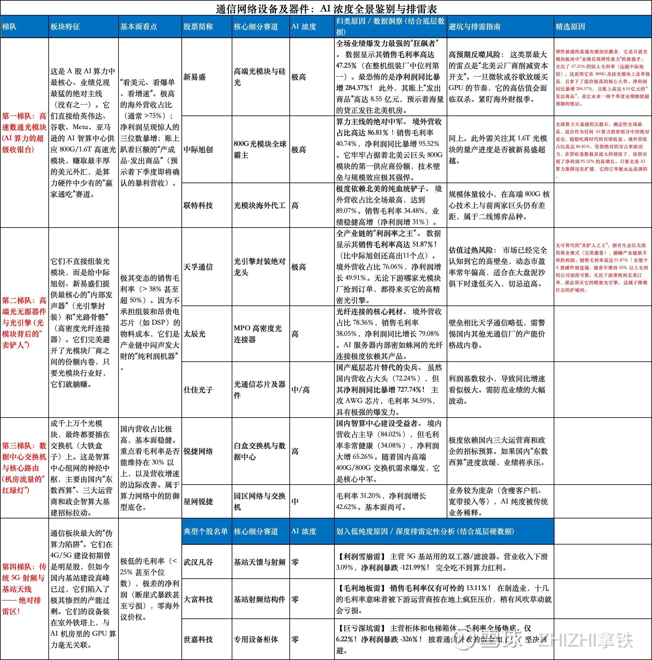 在这个板块,技术迭代的速度堪比摩尔定律(每1-2年速率翻倍)。谁能拿到最新一代(800G/1.6T)的首发,谁就能独吞暴利;落后者只能沦为低端组装厂。同时,“买谁的单”决定了公司的估值天花板,我将其划分为四大生态梯队。