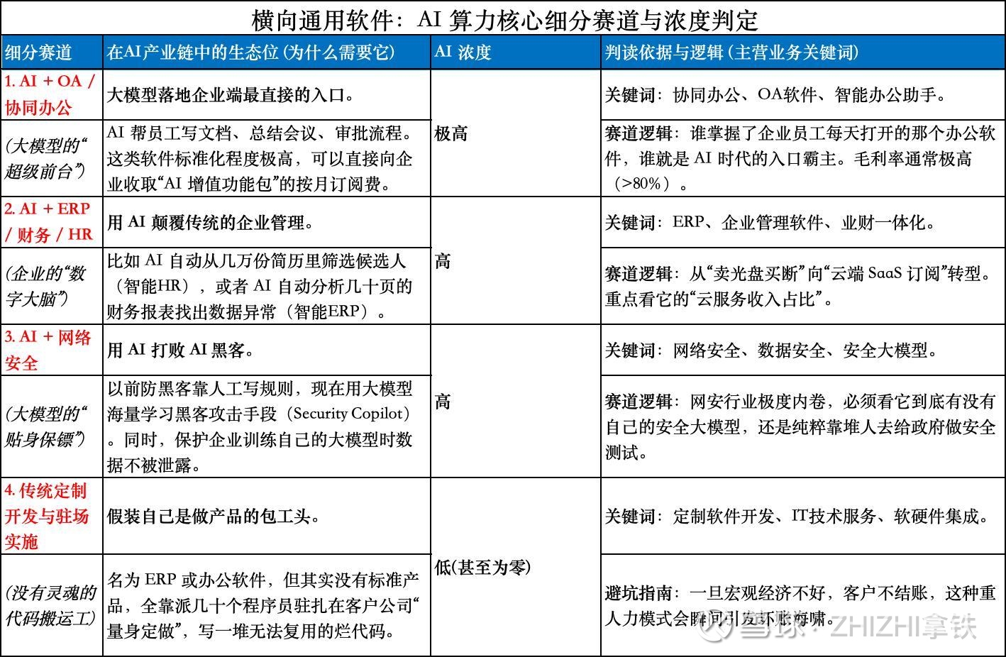 看横向通用软件的财报,有一条铁律:“好的软件公司收的是会员费(SaaS),差的软件公司收的是白条(应收账款)”。可以拿着下面这 4 大量化指标去透视,真假 SaaS 和伪 AI 立刻现形。同时,横向软件的生意模式比拼的是“标准化程度”。标准化越高,AI 赋能越容易,越能躺着赚钱,可以将其划分为四大梯队。在横向通用软件(OA、ERP、网安)板块,投资逻辑就是:“买毛利率最高的,买应收账款最少的!”