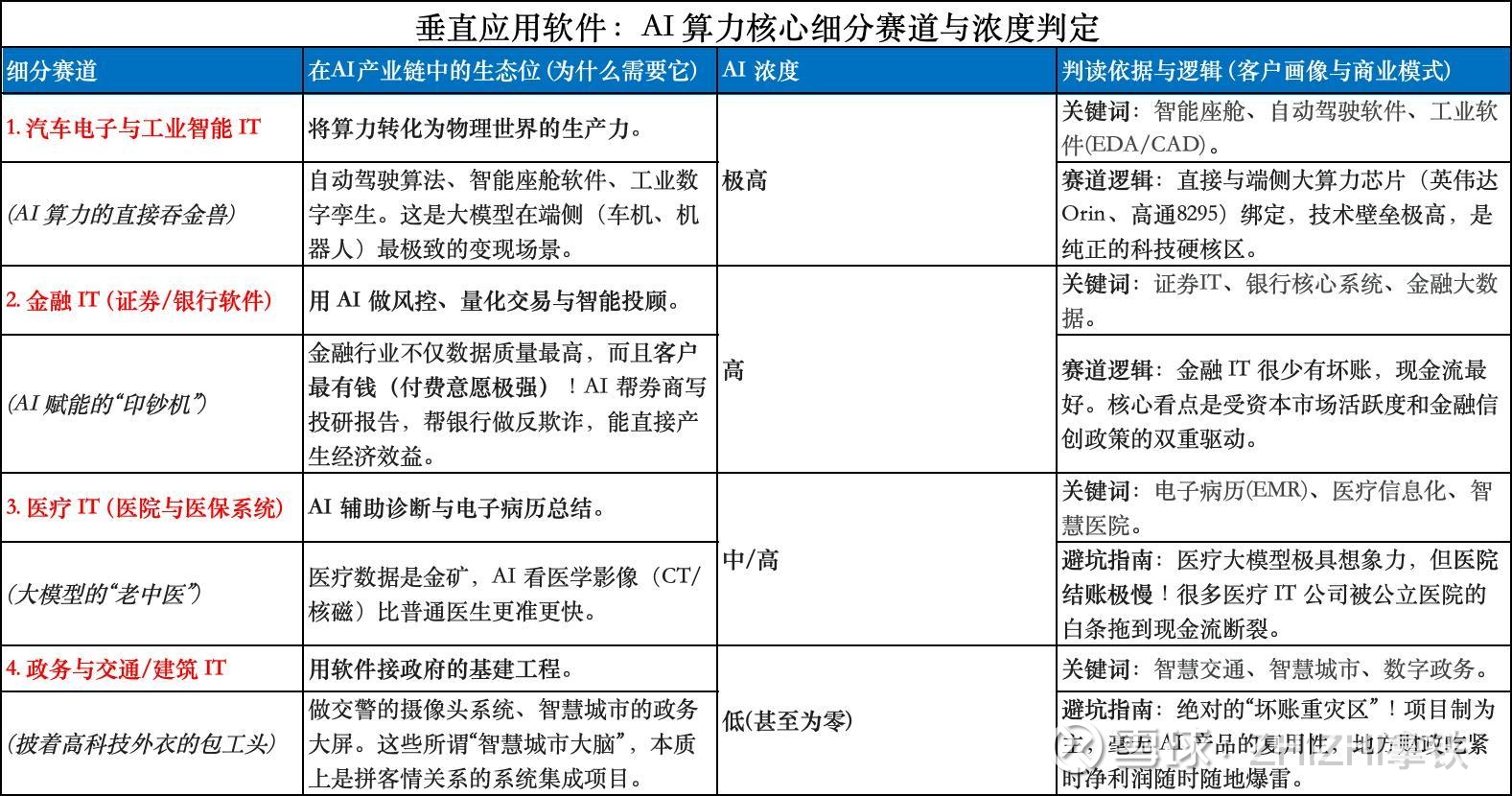 垂直软件板块的排雷核心,只有八个字:“警惕白条,寻找标品”。拿着下面这套 4 大量化指标去透视,能帮你瞬间抓住手里有粮(现金)、眼里有光(AI 研发)的行业真龙。同时,在这个板块里,“你的客户是谁”直接决定了你的账上有没有钱去搞 AI。按行业属性可以将其划分为四大梯队。