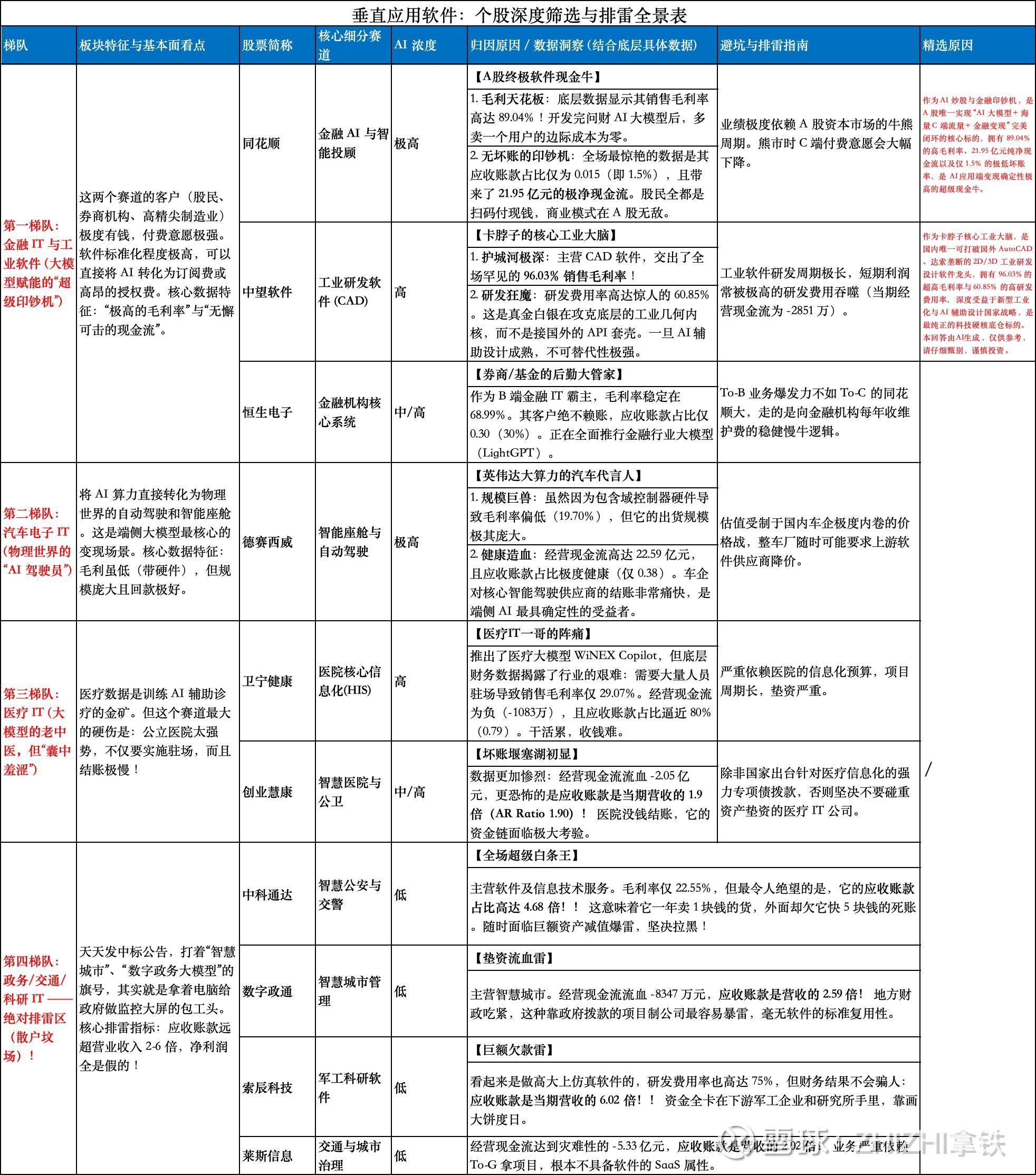 在 A 股的软件分类中,垂直应用软件包含了金融 IT、医疗 IT、政务 IT、汽车 IT 等特定行业的专属软件。在 AI 时代,大模型(如 ChatGPT)虽然上知天文下知地理,但它不会看病,也不懂 A 股的交易规则。谁手里握着行业独家的高质量数据(如医院病历、银行交易流水),谁就能把通用大模型训练成“行业垂直大模型”! 这正是垂直软件公司在 AI 时代最大的护城河。但这同样是一个“雷区密布”的板块。因为垂直软件的客户通常是强势的银行、医院和政府(To-B / To-G),垫资干活是常态。