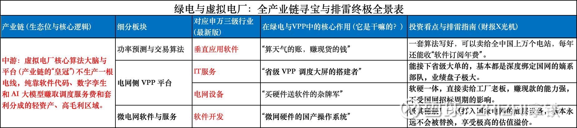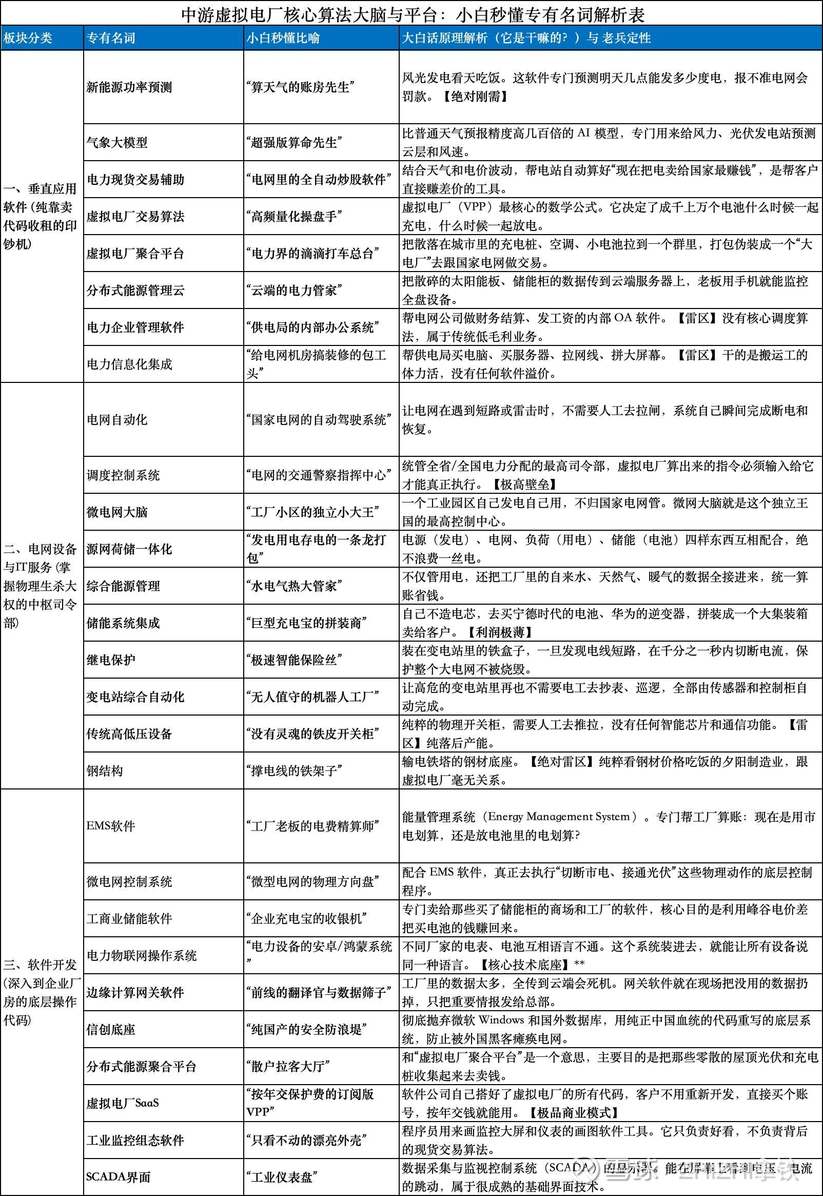各位大家好!在前面的系列文章里,我们沿着电网的物理大动脉一路摸爬滚打,扒了特高压的钢铁骨架、海底电缆的铜芯血管,也扫雷了最底层的电表和配电柜。那是一个重资产、拼产能、看大宗商品脸色吃饭的“硬世界”。但今天,我们的主战场将发生彻底的跨界跃迁——我们正式进入整个虚拟电厂(VPP)皇冠上的绝对明珠:中游核心算法大脑与云平台。在这里,没有轰鸣的流水线,没有堆积如山的钢材铜线,甚至没有可以抵押给银行的厂房。这些公司所有的资产,就是几百台服务器和程序员敲出来的一行行“代码”。