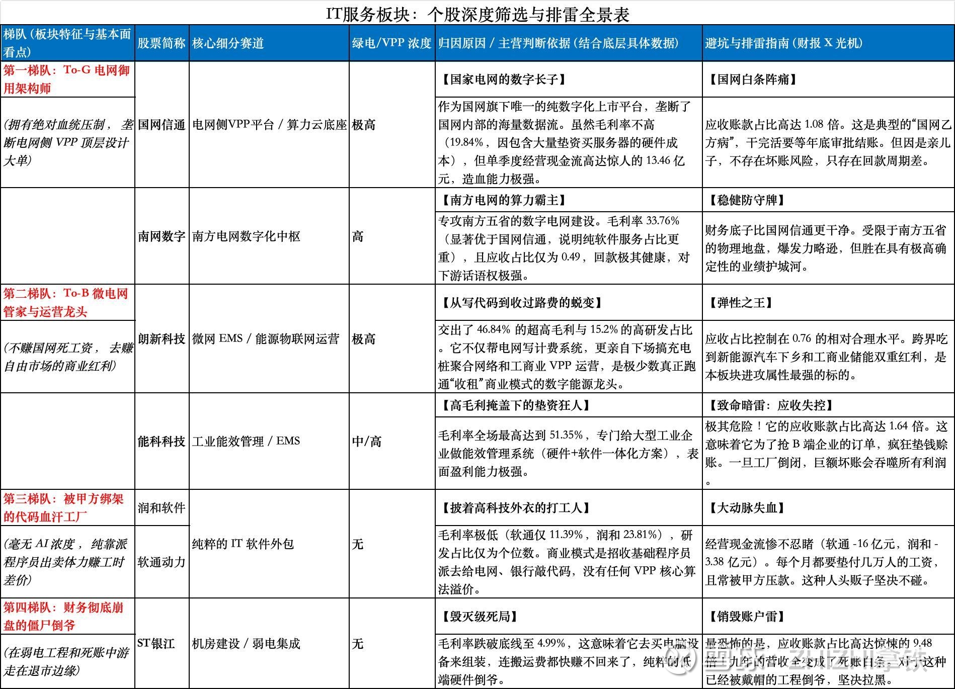 在这个大杂烩里,判断一家公司含金量的唯一标准,就是看它在 VPP 平台建设中,到底是“出脑子(核心架构设计)”还是“出体力(拉网线和外包打字员)”。看“IT服务”公司的财报,核心就是要防范“项目烂尾”和“白条拖死现金流”。因为做定制开发,验收周期极长,国网不签字,你就一分钱拿不到,但程序员的工资每个月都得照发。