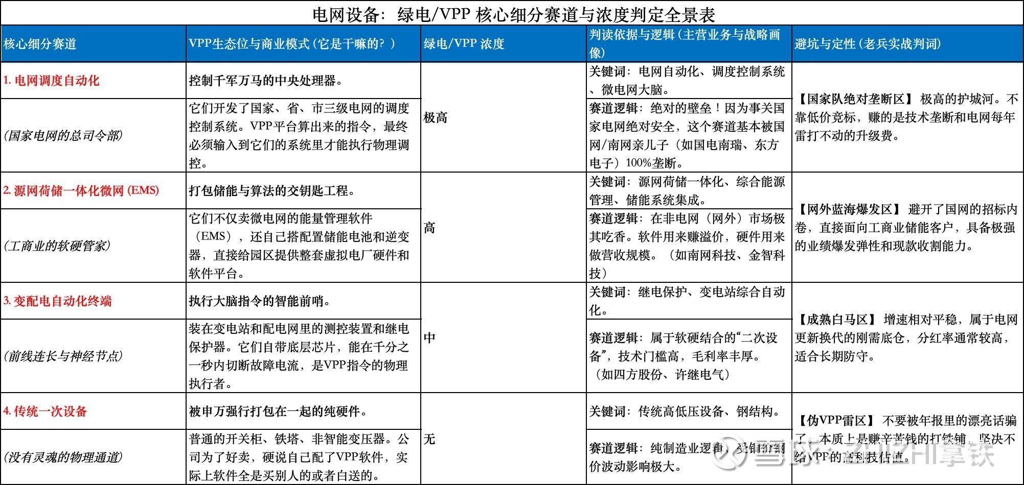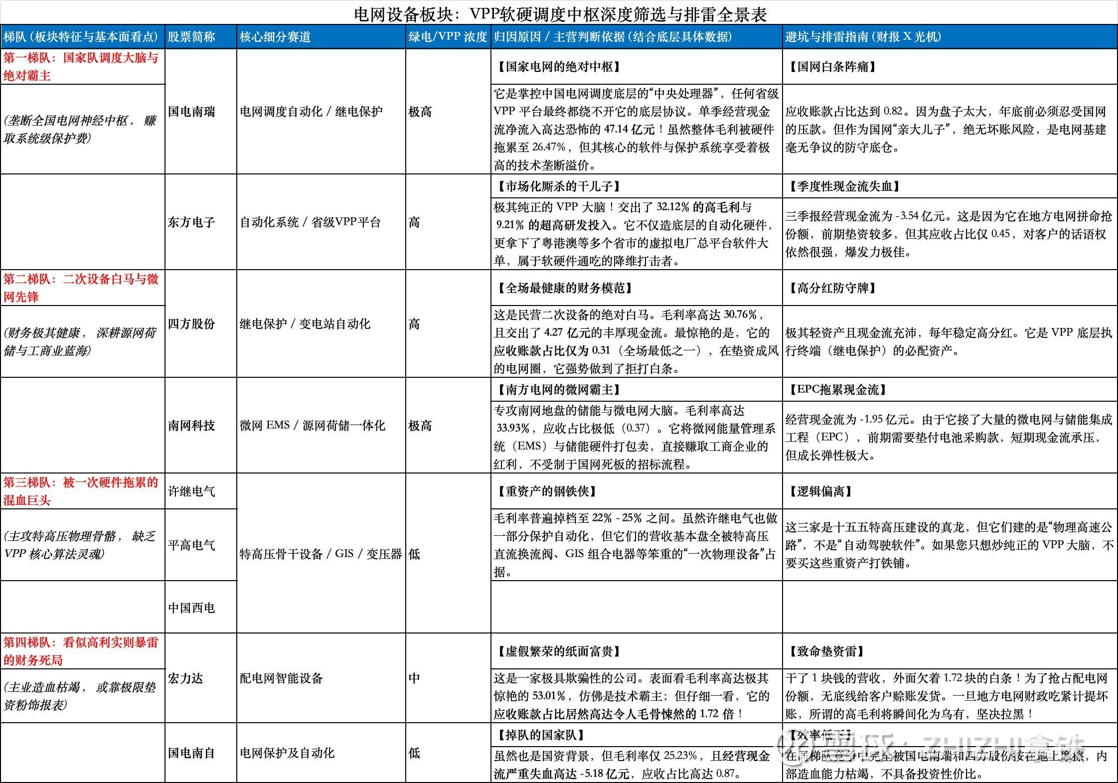 (1) 买“二次”,不买“一次” 一次设备是骨骼肌肉(变压器、开关柜),二次设备是神经大脑(保护、测控、自动化)。VPP的红利只属于能发号施令的“二次设备”。去财报主营业务里找带有“自动化、继电保护、信息与通信”字眼的公司重仓。