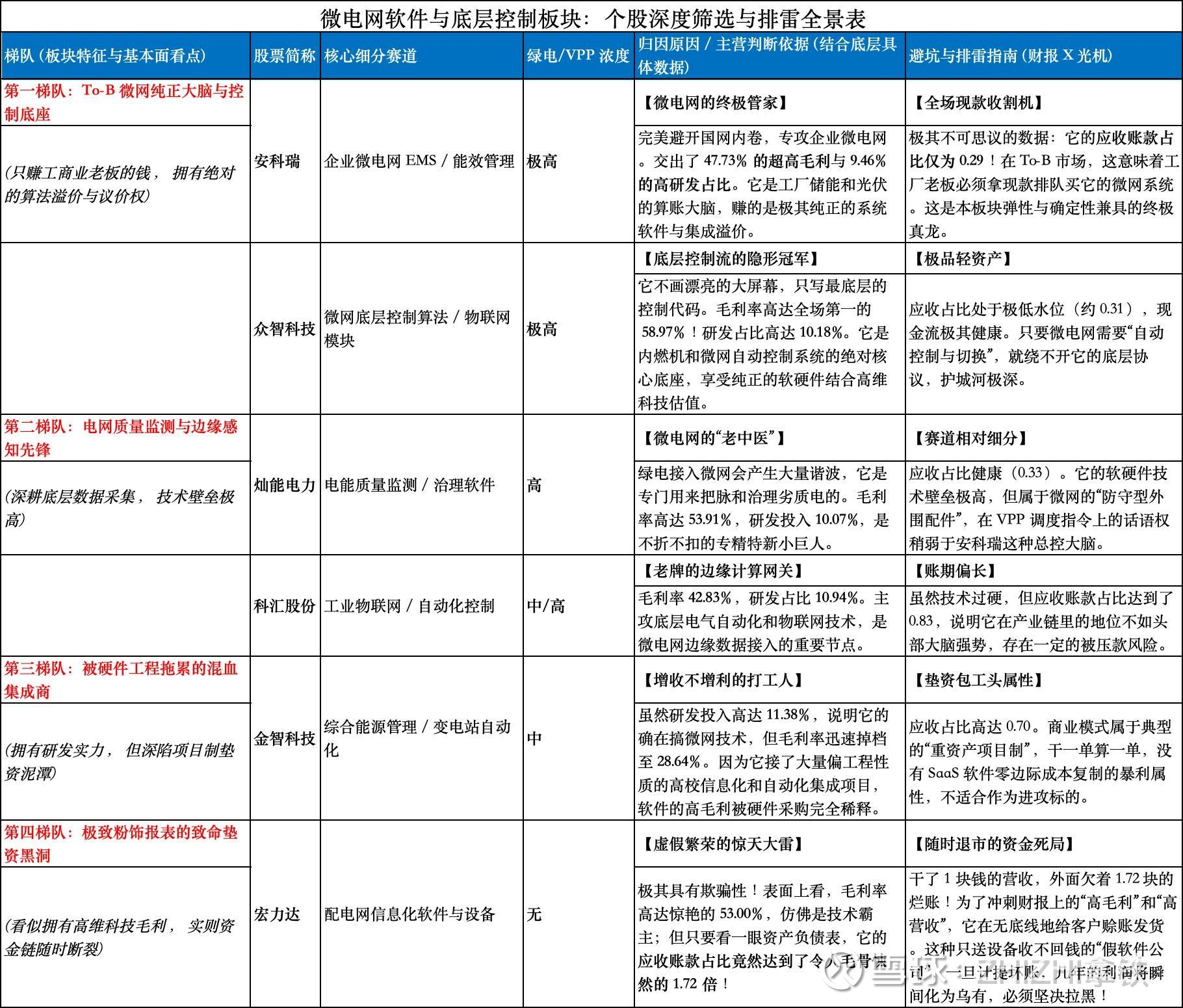 在微电网 EMS(能量管理系统)和底层软件开发这个赛道,客户不是大方的国家电网,而是对成本极其敏感的工厂老板和园区物业。如果一家公司的微网软件不能帮老板真金白银地省电费,它绝对收不到现款! 老兵提取了您数据中极具杀伤力的软件与微网核心指标:毛利率(剥离纯硬件外衣,检验代码浓度)、研发占比(探照底层核心算法)、应收账款占比(测试在 B 端民营老板面前的真实话语权)。