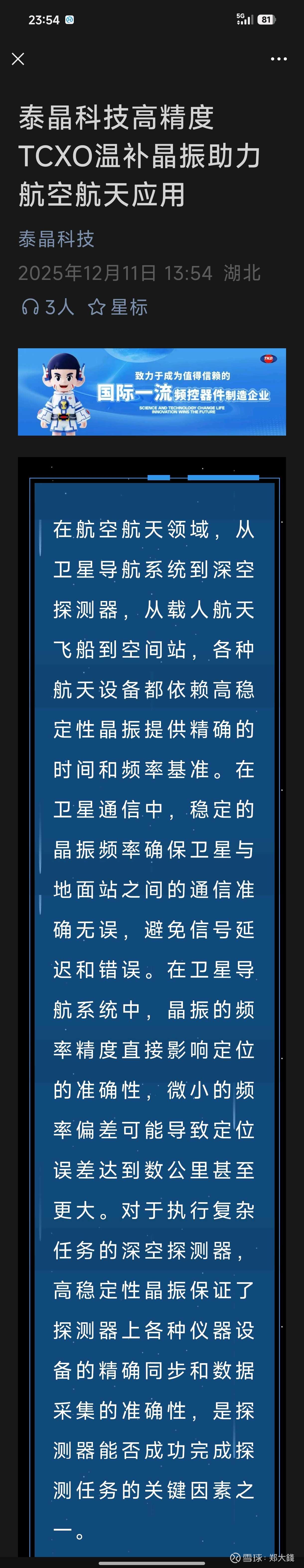 $泰晶科技(SH603738)$ 公司始终坚持对标全球前沿技术,积累自主研发能力,具备高基频和主流尺寸微型音叉芯片的自主设计能力;公司是国内唯一、国际少数掌握石英晶体MEMS技术,并实现微型晶振规模化产业化的企业,公司TCXO、K系列产品广泛应用于卫星通讯以及导航配套芯片、模组及终端产品等。$航天电子(SH600879)$ $中国卫通(SH601698)$查看图片
