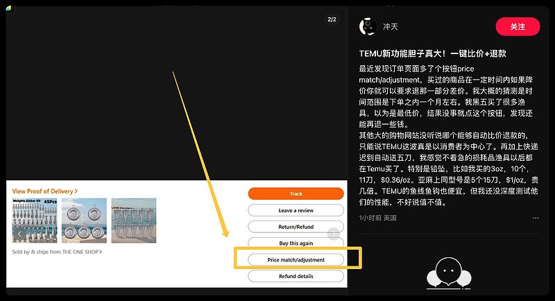 网友:最近发现订单页面多了个按钮price match/adjustment,买过的商品在一定时间内如果降价你就可以要求退那一部分差价。我大概的猜测是时间范围是下单之内一个月左右。我黑五买了很多渔具,以为是最低价,结果没事就点这个按钮,发现还能再退一些钱。