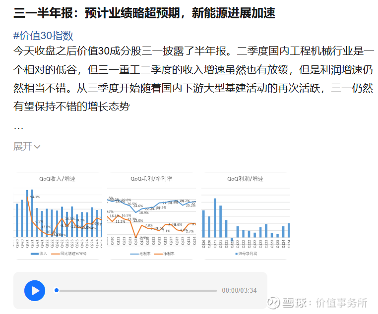 前两天收盘之后价值30成分企业三一披露了半年报。二季度国内工程机械行业是处于相对低谷,三一重工二季度的收入增速虽然也有放缓,但是利润增速仍然相当不错。从三季度开始,随着国内下游大型基建活动的再次活跃,三一仍然有望保持不错的增长态势。