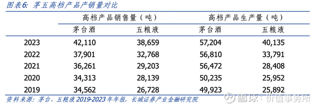 看看下面这张图,茅台、五粮液一年的高端产品生产量也就10万吨的样子,这10万吨还不能全部卖掉,因为要存一些作为来年生产的基酒,大致一年的销售量是生产量的80%。