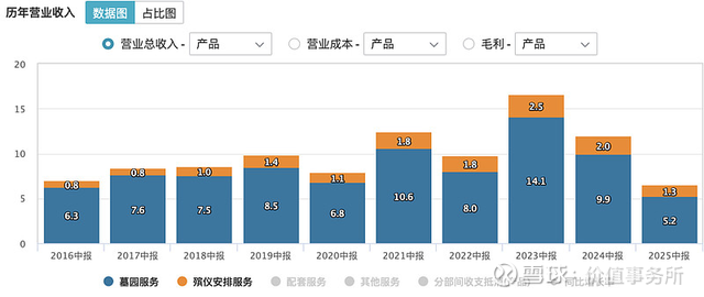 一直以来,除了众所周知的2022,福寿园的业绩都非常稳定,保持着很稳健的速度在增长,但是2024就突然不行了,出现了断崖式下跌。当然不止2024,今年上半年也非常凄惨,2025年上半年实现营收6.1亿,同比减少44.5%;营收大跌就算了,归母净利润还亏了,整体亏损2.6亿,去年同期则是盈利3.7亿。