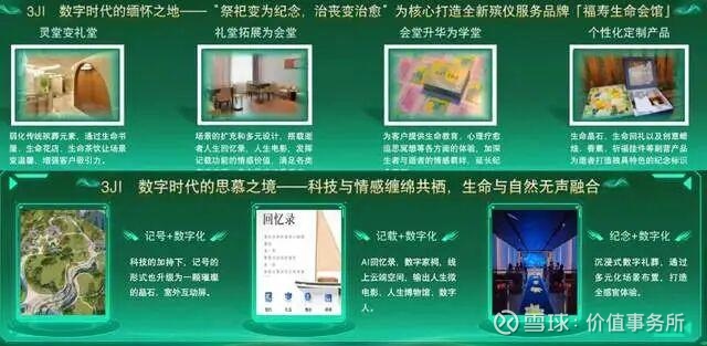 这些年,公司在大力推“3JI” 产品,这个3JI指的是将记号做美,简单粗暴理解就是让墓园变得像公园、将纪念做长,比如包含一场能让参加者留下深刻印象的葬礼仪式,有沉浸式数字礼厅、270 度环屏、全息投影或者草坪音乐会等场景体验,可后续举办家庭团聚、教育启迪的诞辰纪念、周年追思等活动以及将记载做厚,即利用现代科技手段对生命信息进行大规模数字化留存(数字家谱、线上纪念馆等)。