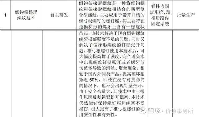 还比如公司自主研发的倒钩偏梯螺纹技术,可以做到相较于国内外同类产品提高破坏扭矩近 50%,由于安全余量大,即使术中由于操作原因反复锁紧松开螺塞,仍然能够保持螺钉座和螺塞不受损伤,能极大提高椎弓根螺钉的使用安全性和有效性。