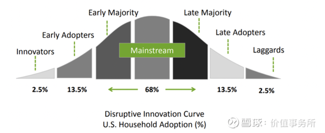 这里也同大家讲一个规律,一般而言,一个新事物开始在终端渗透,前15%进程会比较慢,可一旦达到25%-30%,就会以非常快的速度完成对绝大多数人的普及,对此不太明白的同学,请参考下图。