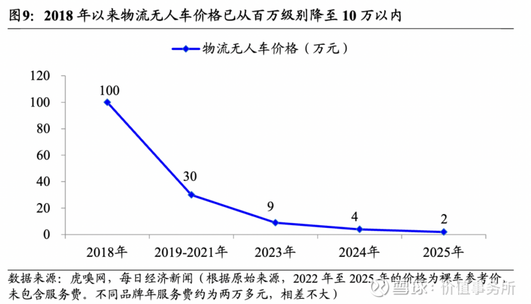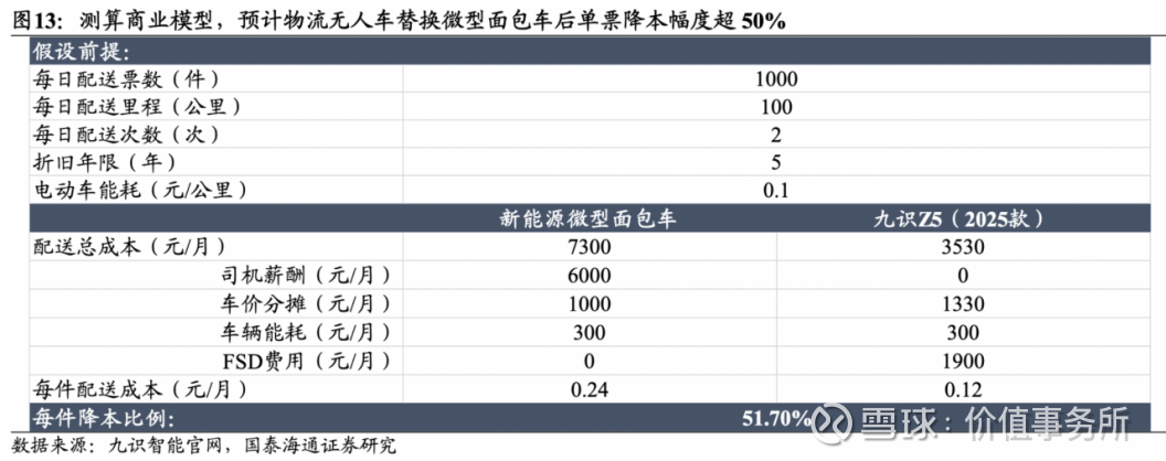 国泰海通证券此前在一份研报里做过一个研究:如果用市面上某款售价7.98万、FSD 订阅费 1900元/月的物流无人车替代现在普遍的新能源微型面包车送货模式(新能源微型面包车均价6万元,司机月工资平均6000元),可以降本多少?