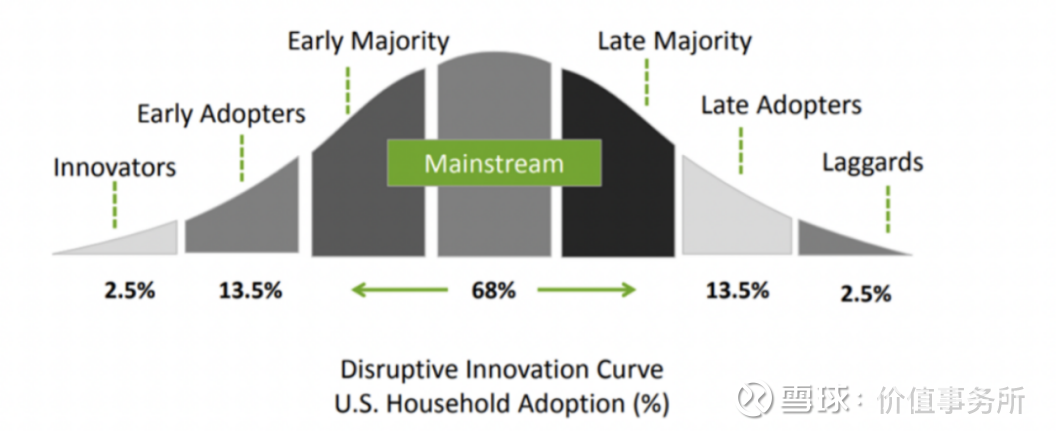 一般而言,一个新事物开始进行渗透时,前2.5%进程会比较慢,可一旦突破15%这个临界点,就会以非常快的速度完成普及,对此不太明白的同学不妨参考下图。