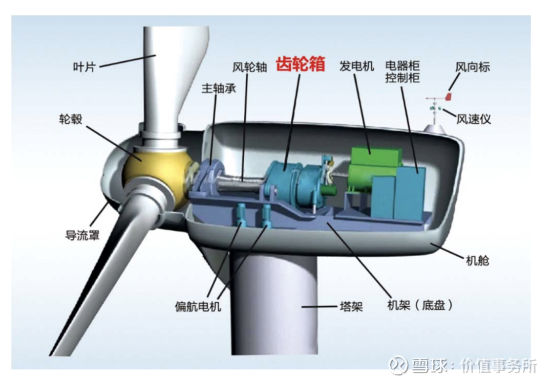 德力佳属于风电产业链中游,它不是什么风机厂商,但却比风机厂商更关键,因为它做的是整个风机最核心、技术难度最高的部件——齿轮箱,也就是下图红字那部分。哪怕再外行,看到这张图也应当明白了齿轮箱的重要性,毫不夸张地说,风电主齿轮箱性能直接决定了风机的运行效率、可靠性和使用寿命。