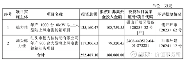 我们看德力佳本次募资的核心目的是什么,其募投的就两个项目,一是年产 1000 台 8MW 以上大型陆上风电齿轮箱项目,二是汕头市德力佳传动有限公司年产 800 台大型海上风电齿轮箱汕头项目。